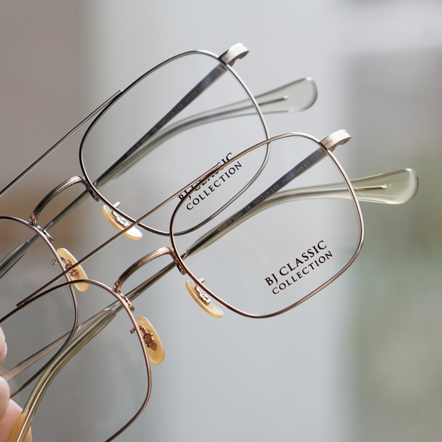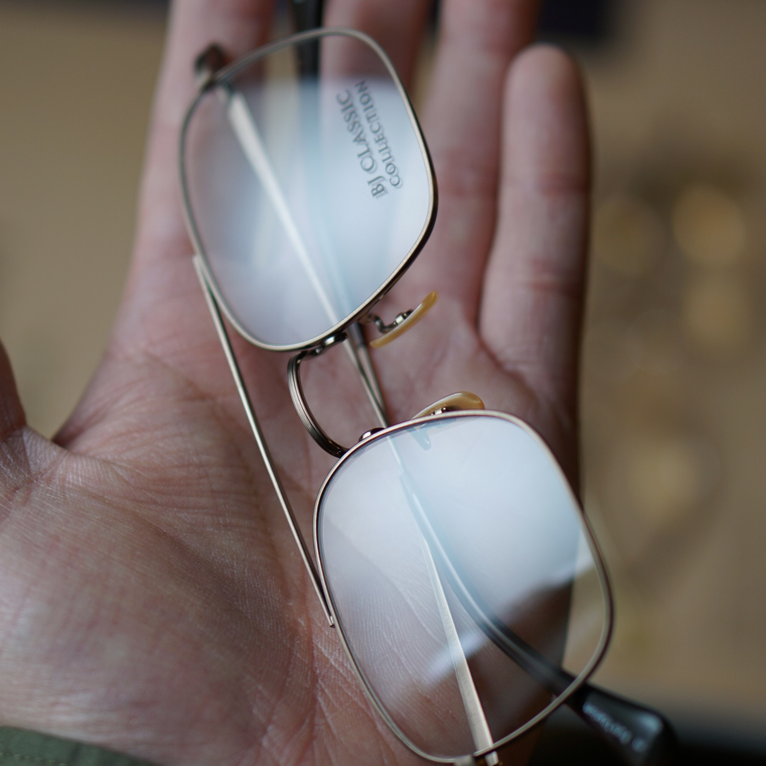 スクエアのツーブリッジは、少なからずナードな雰囲気や違和感を楽しむ部分があると思っておりますが、こちらの新モデルはBJらしい良い意味でクセがなくお顔に馴染むデザイン。